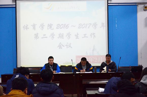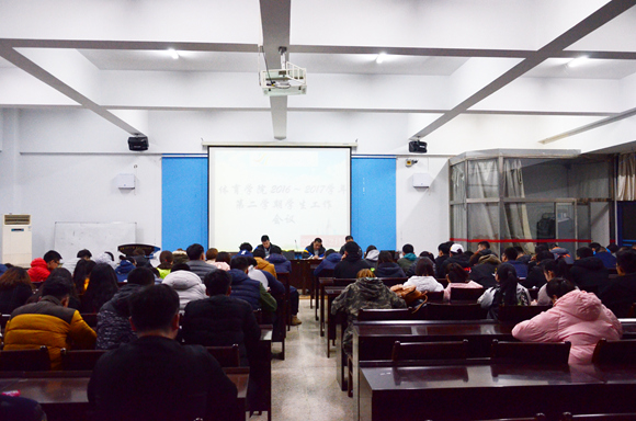 本网讯(文/图 体育学院学生会)2月27日晚,在学院二楼多媒体报告厅召开体育学院2016—2017学年第二学期学生工作会议。我院党总支副书记韩武、学工办主任孟亚彪、团总支书记敖永胜以及各班班主任、学生会、各班级干部参加本次会议。